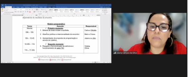 O próximo Encontro Virtual de Escuta sobre TIC já tem data marcada: será no dia 25 de abril, voltado para as assessorias dos polos sindicais. Mesmo sendo uma atividade virtual, contou com a tradicional mística com poesias de Seu Bio (da Academia Sindical) e Luiz Souza, (assistente de Suporte de Sistemas) entrelaçadas a um jogo interativo em que as e os participantes preencheram uma tela com palavras, construindo de forma coletiva e simbólica suas expectativas das TIC.