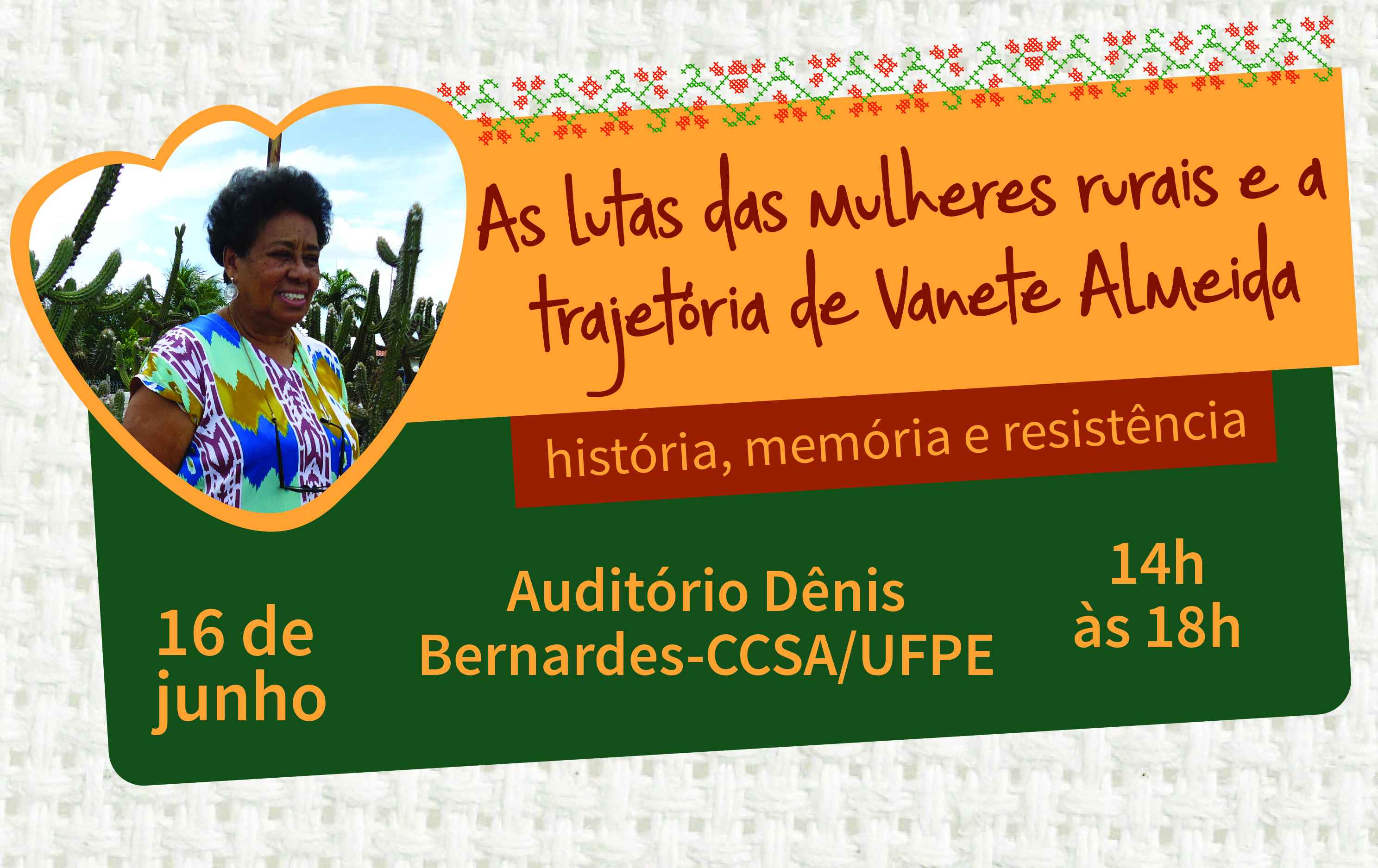 O Departamento de Serviço Social da Universidade Federal de Pernambuco (UFPE) realiza uma tarde de debates sobre o tema: “Luta das mulheres rurais e a trajetória da liderança feminista Vanete Almeida: história, memória e resistência”, na tarde desta quinta-feira (16), a partir das 16 horas, , no auditório Denis Bernardes, no Centro de Ciências Sociais Aplicadas da Federal.