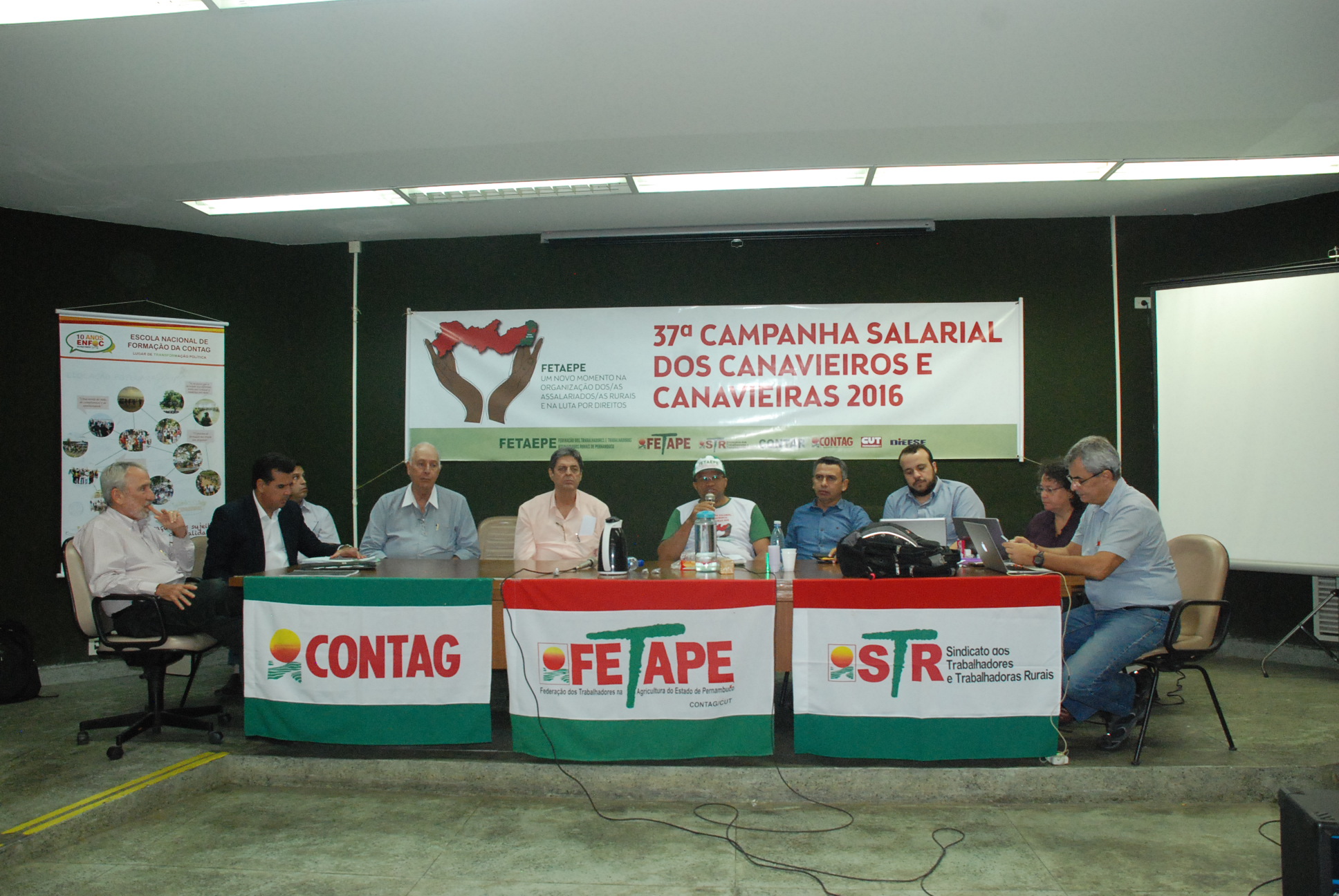 Trabalho conjunto - Dirigentes dos Sindicatos das Matas Norte e Sul, da Fetape, da Fetaepe e da Confederação Nacional dos Trabalhadores e das Trabalhadoras Assalariados Rurais (Contar), representantes da Confederação Nacional dos Trabalhadores na Agricultura (Contag) e do Departamento Intersindical de Estatísticas e Estudos Socioeconômicos (Dieese) participaram de todo o processo de negociação, que contou com a importante mediação da SRTE no diálogo com os representantes do patronato. As centrais sindicais (CUT e CTB) também marcaram presença.