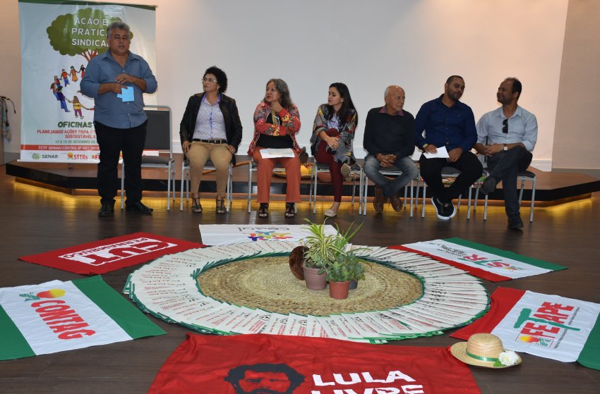 A manhã de abertura da Oficina contou com uma mística que apresentou alimentos do campo, sementes crioulas, a água, a terra e outros símbolos do trabalhador e da trabalhadora rural, que juntamente com as bandeiras de luta do movimento sindical retrataram a importância da agricultura familiar para o desenvolvimento sustentável e manutenção de direitos para as populações do campo.