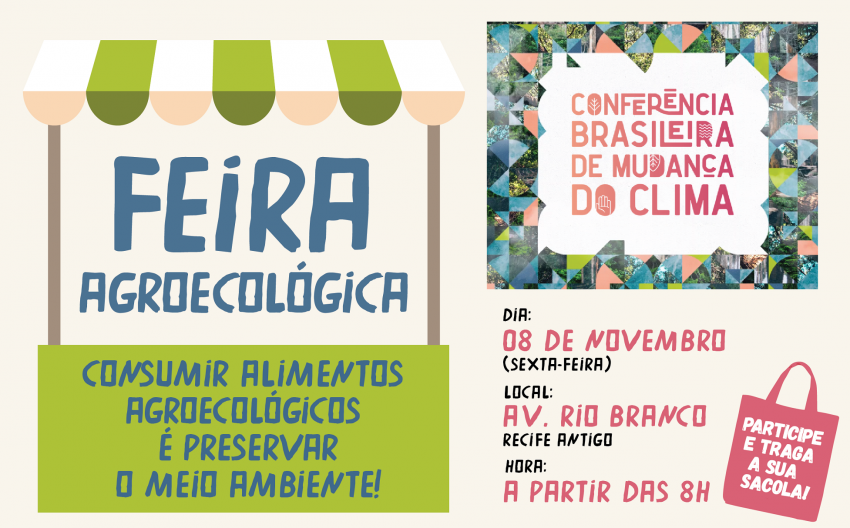 Nesta sexta-feira (08), a partir das 8h, na avenida Rio Branco, no bairro do Recife Antigo, será realizada uma Feira Agroecológica como parte das atividades do último dia da Conferência Brasileira de Mudança do Clima. Ao longo de 20 barracas, serão oferecidos alimentos in natura como frutas e verduras sem agrotóxicos e produtos beneficiados como pães, bolos, café, geleia, cuscuz, além de artesanato e empreendimentos da economia solidária. Os produtos serão oferecidos por agricultores e agricultoras de diversos municípios como Rio Formoso, Bonito, Sirinhaém, Lagoa de Itaenga e Igarassu que praticam a agricultura familiar de base agroecológica.