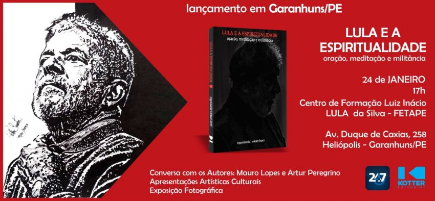 Ocorrerá no próximo dia 24/01/2020 em Garanhuns/PE, o lançamento do livro "Lula e a espiritualidade, oração, meditação e militância", é o primeiro título da Editora 247 em conjunto com a Kotter Editorial. O livro surgiu a partir de uma correspondência de Lula com Mauro Lopes, editor do 247 e fundador do canal Paz e Bem, idealizador e organizador da obra. Numa carta em16 de julho de 2019, Lula apresentou o tripé de sua espiritualidade, que dá título ao livro: "oração, meditação e militância".