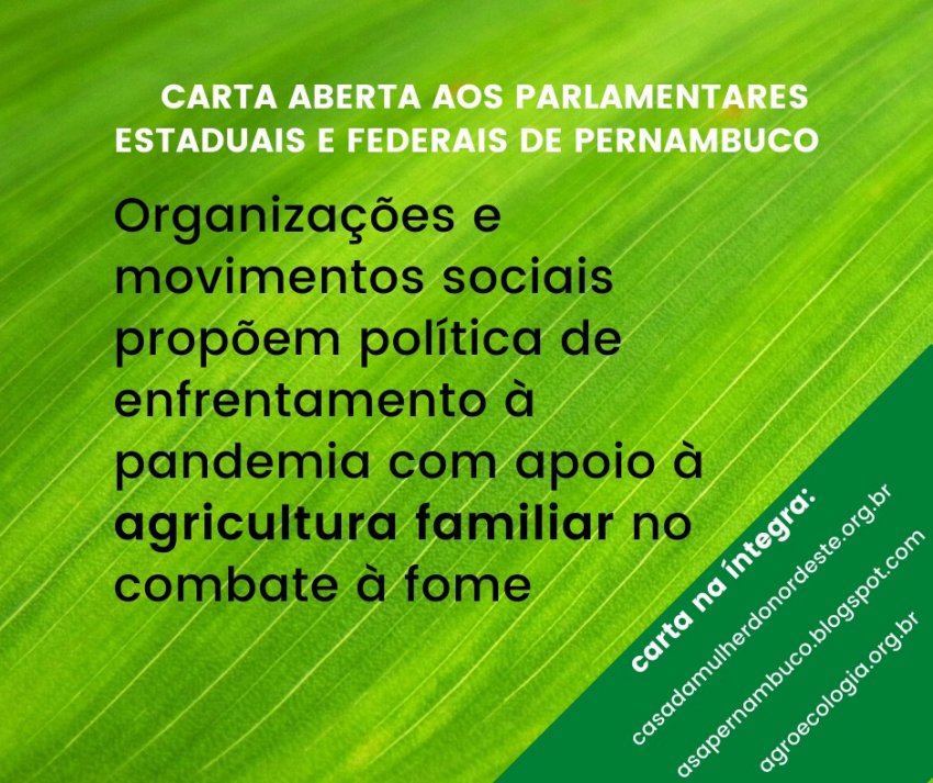 A Carta direcionada aos parlamentares de Pernambuco propõe uma política de enfrentamento à pandemia do Coronavírus, com apoio à agricultura familiar no combate à fome. O documento foi escrito por organizações, articulações, redes, comissões, conselhos, fóruns, pastorais e movimentos sociais e sindicais do Estado, que estão acompanhando e monitorando o avanço do Coronavírus em Pernambuco.