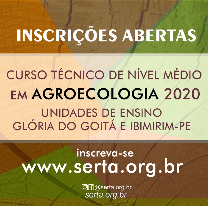 O Serviço de Tecnologia Alternativa – SERTA prorrogou as inscrições para seleção de novas turmas do Curso Técnico de Nível Médio em Agroecologia para as Unidades de Ensino Glória do Goitá, na Zona da Mata, e Ibimirim, no Sertão de Pernambuco, que seguem até o dia 15 de maio de 2020. A oferta é de trezentas vagas para quem tem interesse em aprimorar habilidades e competências para o desenvolvimento sustentável. O curso é gratuito e tem duração de dezoito meses. Inscrição deve ser realizada no site www.serta.org.br.