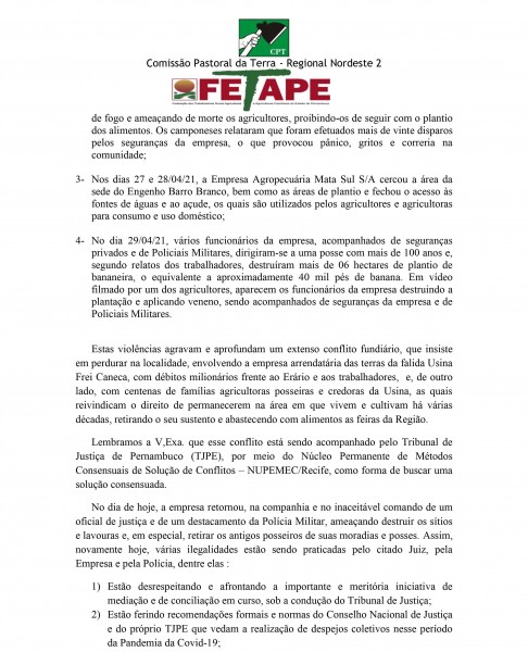 Atentados armados, ameaças de morte, impedimento do acesso à água e destruições de lavouras foram algumas das ações promovidas pela empresa nos últimos dias. A conduta da Agropecuária Mata Sul S/A também desrespeita e afronta o processo de conciliação do conflito, de iniciativa do Tribunal de Justiça de Pernambuco (TJPE). Segundo o documento, essas violências agravam e aprofundam o extenso conflito fundiário envolvendo, de um lado, a empresa arrendatária das terras da falida Usina Frei Caneca, possuidora de débitos milionários frente ao Erário e aos trabalhadores e trabalhadoras, e, de outro lado, centenas de famílias agricultoras posseiras e credoras da Usina, as quais reivindicam o direito de permanecerem na área em que vivem e cultivam há várias décadas. As organizações requerem urgência na implementação de medidas que evitem desfechos imprevisíveis, bem como o cumprimento de normas constitucionais, processuais, legais e procedimentais que regem uma ação desse porte”, destacam.