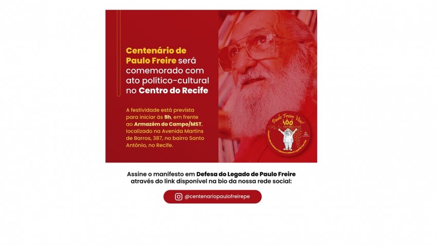 Neste domingo (19), um ato político-cultural no Recife comemora o Centenário de Paulo Freire - considerado uma das maiores referências da educação do mundo. A festividade está prevista para iniciar às 9h, em frente ao Armazém do Campo, localizado na Avenida Martins de Barros, 387, no bairro Santo Antônio. Na ocasião, os participantes seguirão em cortejo até o Marco Zero.