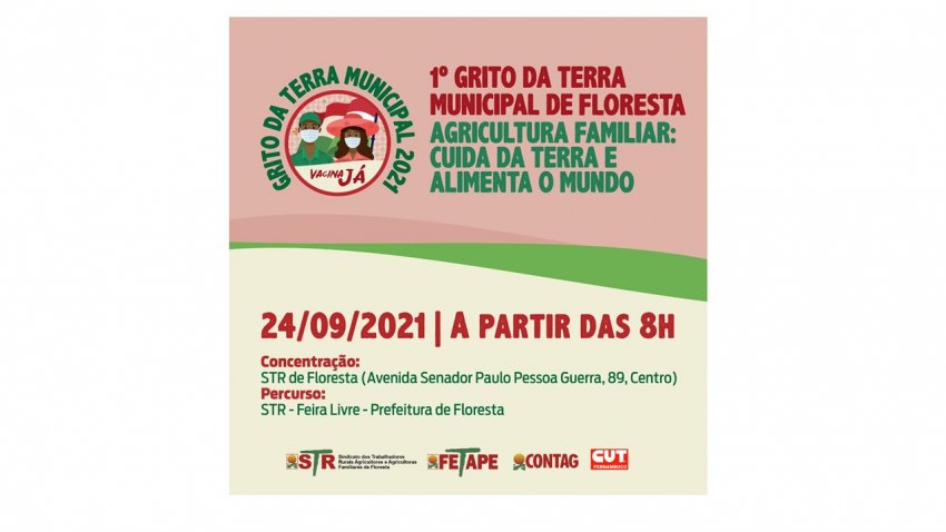 No próximo dia 24 de setembro, o Sindicato de Trabalhadores Rurais Agricultores e Agricultoras Familiares de Floresta realizará o 1º Grito da Terra Municipal, com concentração na frente do STR, a partir de 8h da manhã. A expectativa é de que mais de 300 pessoas participem da caminhada que sairá do centro da cidade e vai percorrer as principais ruas até a sede da prefeitura municipal.