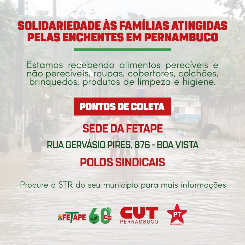 Vale destacar que, além das doações no 11° Congresso intitulado: Plantar Sonhos, Colher Esperança, a Fetape colocou à disposição a sua sede localizada na Avenida Gervásio Pires, 876 Boa Vista, Recife e os dez Polos Sindicais como pontos de coleta de doações. A campanha também tem a parceria da CUT-PE e do Partido dos Trabalhadores (PT).