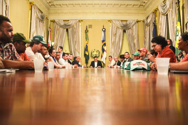 Com a chegada na sede do governo, uma comissão formada por representantes das comunidades, da CPT, da Fetape e do MST foi recebida pelo governador Paulo Câmara. Estiveram presentes também o secretário de Justiça e Direitos Humanos, Cloves Benevides, o secretário Desenvolvimento Social, Criança e Juventude, Edilázio Wanderley, o chefe de gabinete, Marcelo Canuto, o procurador do Estado de Pernambuco, Paulo Rosenblatt e o subdefensor de Causas Coletivas, Rafael Alcoforado, o gabinete do deputado estadual Doriel Barros, além de representações das comunidades.
