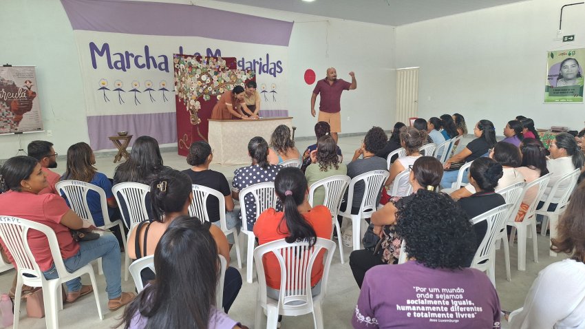 No dia 20 de março, o Polo Agreste Meridional recebeu a Cia Burlesca de Teatro Político em uma ação do Março de Lutas. Reconhecida como uma das principais companhias de teatro político do Distrito Federal, a Cia Burlesca traz em seu repertório espetáculos que questionam e provocam reflexões, desmascarando a realidade, problematizando estereótipos, preconceitos, a manipulação da informação e as disputas de poder. A ação foi organizada pela Comissão de Mulheres do Agreste Meridional e contou com a presença de 13 sindicatos, da presidenta da Fetape, Cícera Nunes, da diretora de Política para Mulheres, Adriana do Nascimento, e da diretora de Organização e Formação, Jenusi Marques.
