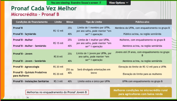 Evandro também destacou as novidades das linhas de crédito da edição do plano safra 2025/2026. Os limites de crédito totais para uma família de três pessoas, um homem, uma mulher e um filho/a, podem chegar até 38 mil reais. Isso é possível por meio da seguinte lógica: O pai e a mãe acessam a linha de crédito do Pronaf B, para ele o limite de crédito vai até 12 mil e para ela 15 mil reais, os jovens podem acessar também o Pronaf B, com limite de crédito de até 8 mil reais, para fechar a conta dos 38 mil o pai ou a mãe pode também entrar com um pedido de crédito do Pronaf B para Instalações Sanitárias, que tem limite de crédito de até 3 mil reais.