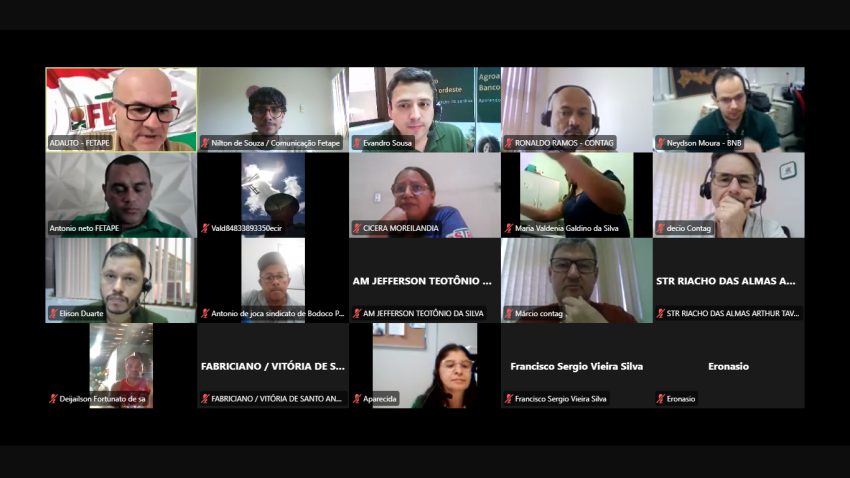 A Fetape realizou na manhã do dia 28 de agosto uma reunião virtual com o objetivo de debater sobre o Plano Safra 2025/2026. Entre os assuntos foram abordados as linhas de crédito do Pronaf e as medidas legais para regularização de dívidas rurais. Participaram do encontro cerca de 80 pessoas, entre lideranças sindicais, assessorias de polo e gestores do Banco do Nordeste (BNB).
